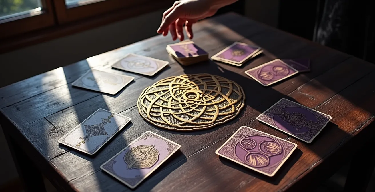 Una de las técnicas más innovadoras es la Cruz Celta Fractal. Este método consiste en usar la estructura completa de 10 cartas para explorar en profundidad una única posición conflictiva de una tirada anterior. Imagina que en una lectura, la carta en la posición «Obstáculo» es particularmente enigmática o potente. En lugar de quedarte perplejo, realizas una Cruz Celta completa solo sobre esa carta. El «Obstáculo» se convierte en el nuevo «Presente», y las 10 cartas de la nueva tirada revelan las capas ocultas de ese bloqueo: sus raíces, su potencial inconsciente, el temor que lo alimenta y las vías para su resolución. Es una técnica de «zoom» de máxima potencia.